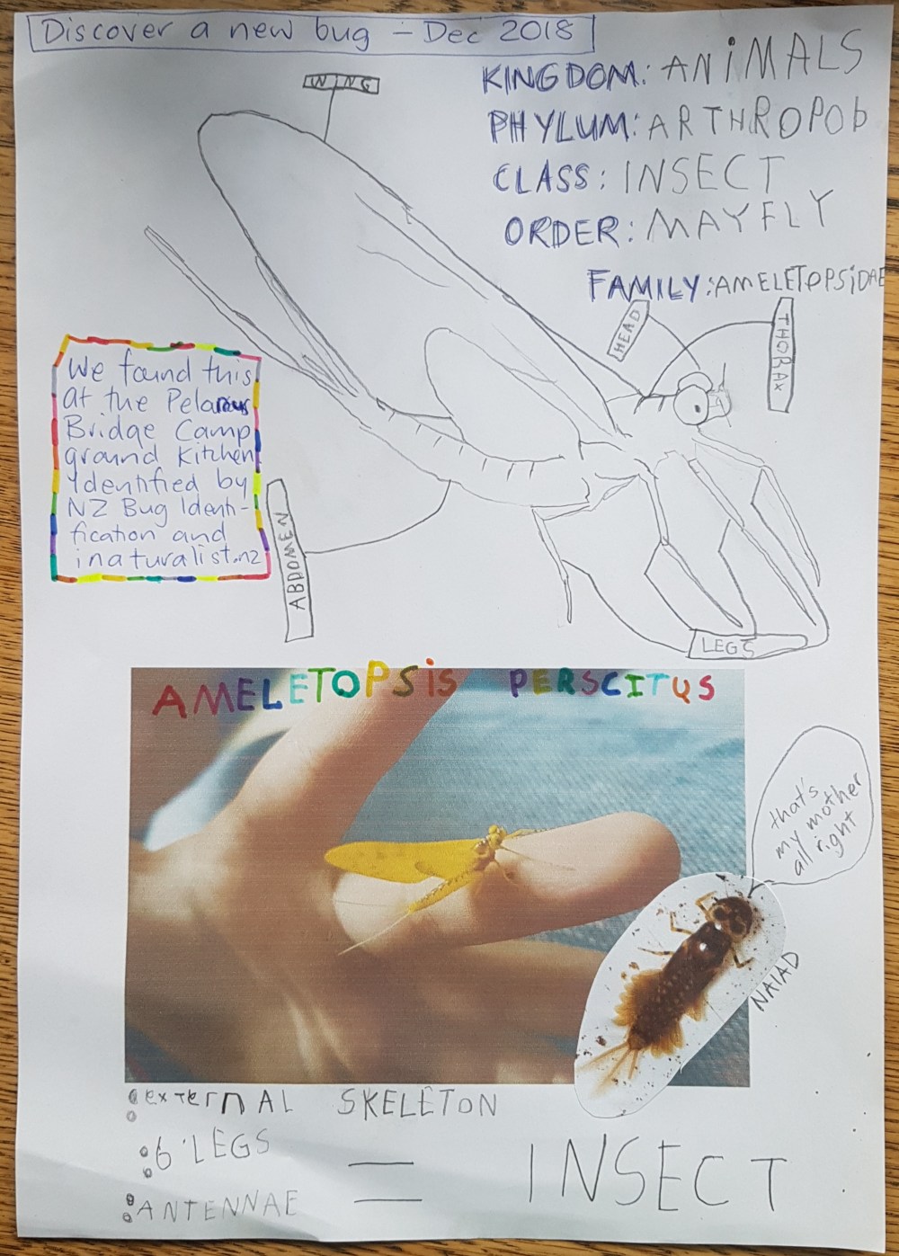 So we join the Bug Identification NZ Facebook group and it’s a mayfly – Helena uses the index and finds the mayflies in our book and it is like them, but yellow… it’s called Ameletopsis perscitus. The coolest thing was getting bug nerds all excited – in less than an hour 13 😮👍❤ and 7 comments and it was identified with a reference! and it made Helena think bugs are cooler.. thank-you people we don’t know.