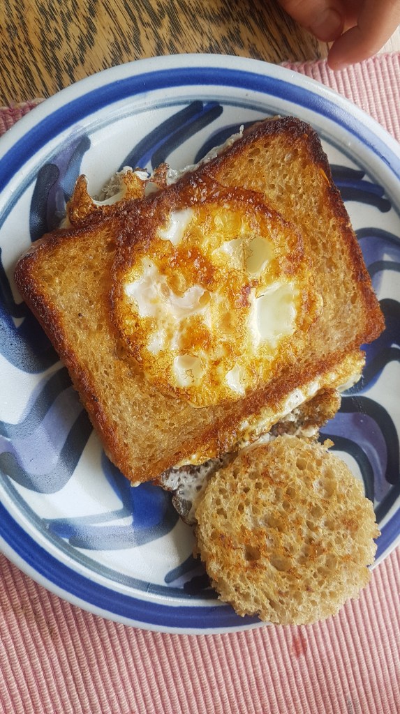 Since then they have become a regular breakfast thing and are getting more and more “perfect” with her noticing other things to to make them better – type of bread, hole size, experience in egg cracking, amount of oil, and heating the pan first. I think she’s doing alright with the egg test.