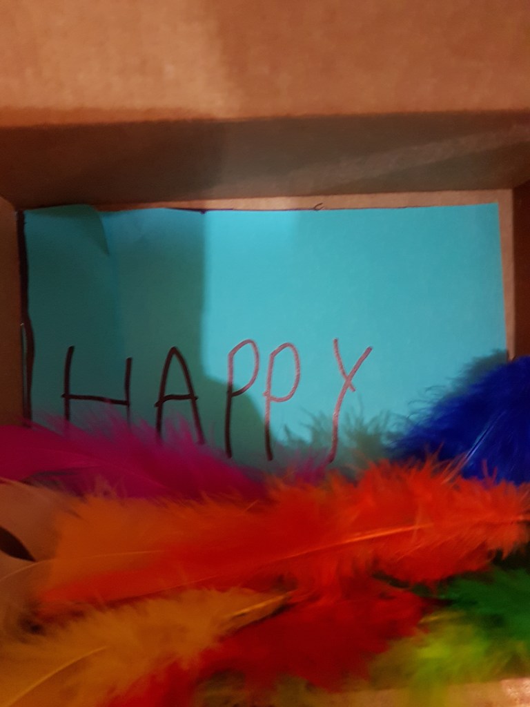 It seemed to also be important to record the names of these feathers so that they would not be forgotten, we have precedent for this mainly due to Helena’s love of making up complicated original names for everything under the sun when she was younger. Helena made a grid on a box to record the names of the feathers. In the nature of a game the feathers themselves started to take a back seat to the box that was being prepared for them, it was a tough elimination where only one feather of each colour could be in the box itself. Less names to work out how to spell maybe. After she had filled in her grid she made pictures as a label associated with the name – a symbol that meant them. This activity from bird to just feathers was sustained over days and she was particularly proud of each new development. The last thing she did, “I just have to”, before bed was to write the word happy to put in the bottom of the box with her feathers.