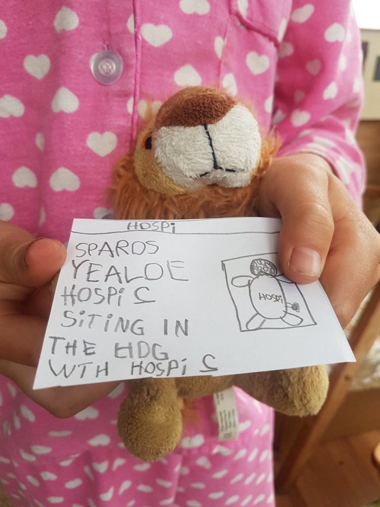 This one lets us know that this is Hospi, Hospi likes to eat sparrows, the colour yellow, their favourite ‘person’ is Hospi 2, and that they like to hang out in the hedge with Hospi 2. I was informed that Hospi had hung out in the hedge with out Hospi 2 but it wasn’t as much fun as when Hospi 2 was there. All these toys have a massive back history, she remembers stuff like how many times the toys have hung out in the hedge at the end of the driveway! Helena proudly showed me that some of her soft toys had put her as their favorite, and one has it’s favourite place as being in her arms…