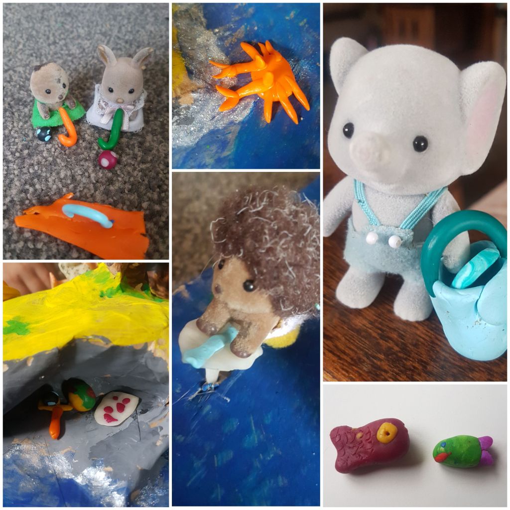 This project was conceived to replace the island made out of paper that is in the bathroom, apparently our towels love islands so she is making them one (some justification for not taking the project seriously perhaps)… and the Sylvanians will get to go there on field trips. She did concede that these are all inanimate so she was really making it for herself. I have noticed there is a theme of the cartoon style of tropical islands in her drawings.