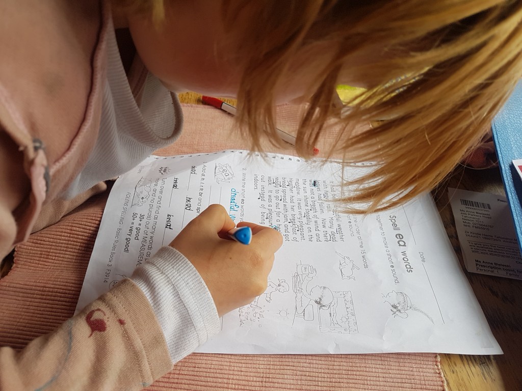 At the beginning of the year Helena said she wanted to be able to spell better, I think to be more confident with her writing. I was a bit sceptical (was it a passing fancy) and worried (because I can’t spell, I don’t know the rules) so I put it on the back burner… then I broke my wrist and resorted to old school books style work and she will be going to school for a few weeks soon so needs a degree of schoolasizing.