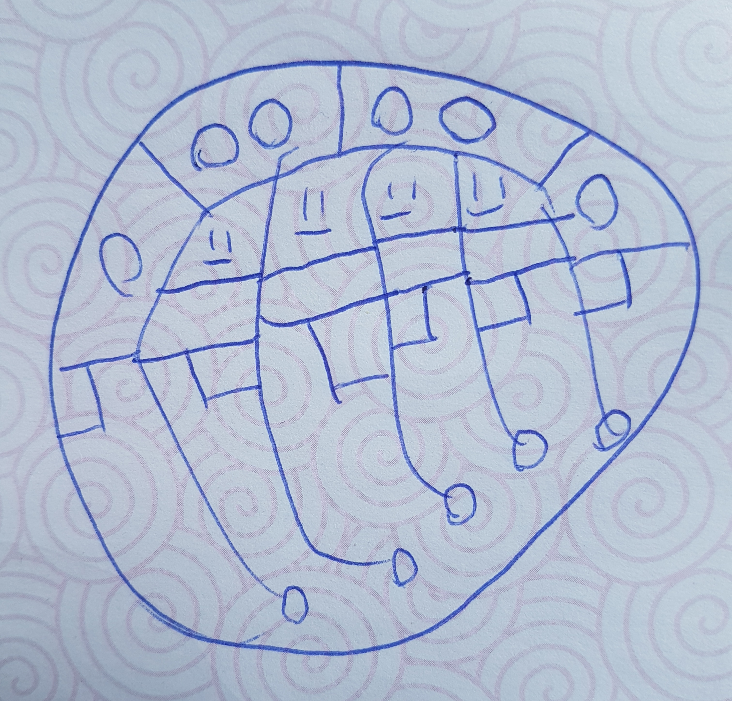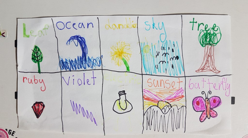 I think my child has a thing for labeling, or is it filling or just grouping things. When she was little it was expressed in pictures where she would divide up the space then put things in the divisions. Helena’s non figurative art still has patterns. I don’t know what this means, I think it helps her with division, symmetry and other mathematical ideas. I only made this conclusion after she did something obvious, even for me, she had counted the dots in one of her works and the dots in the compartments showed the numerical sequence 1, 2, 3, 4 etc – she was nearly 4 at the time.
