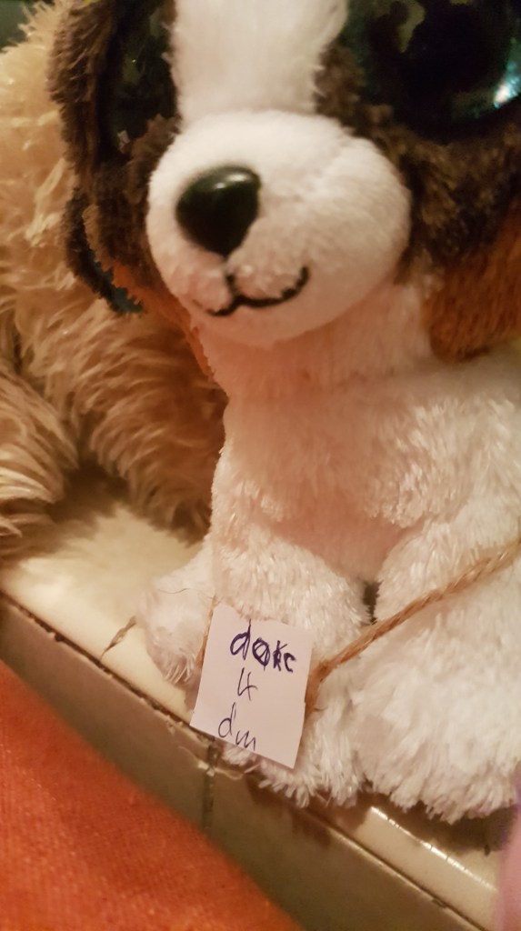 This is one she got one of her friends to play along with, it was a pet shop. It says the name, Duke, that it is 4 years old and it’s a male dog.