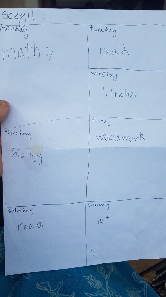 Suddenly the notes changed, got more serious. I had to sign up for specific classes at the After Academy (the after having gone to bed)… I had a list of 8 and chose 5. The next thing Helena did was write herself a timetable of what work she would prepare for me on what night! So far I have had Biology and Woodwork.