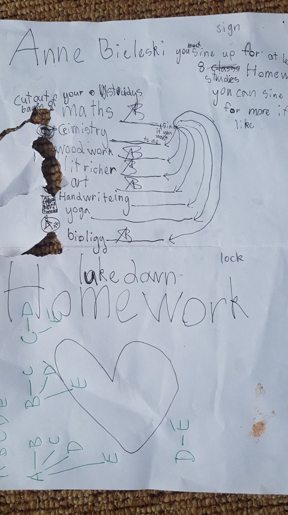 I don’t like homework as I have seen how it is detrimental to parent child relationships, all that nagging, all that implying that whatever project the kid had in their head is less important than what someone external to the family believes is important… I did get kids to take home stuff they didn’t finish in the allotted time at school which I wouldn’t do now having watched how hard it is for my pedantic perfectionist child to write, especially when it is for an external authority. Recently Helena has been writing me homework, she called it “lockdown homework” (though we are not locked down at the moment) which just shows how much she is influenced by the news on the radio… I have never even mentioned or given home work to her, I don’t think in her 4 week school career she was given homework, and I think she knows I don’t like homework.
