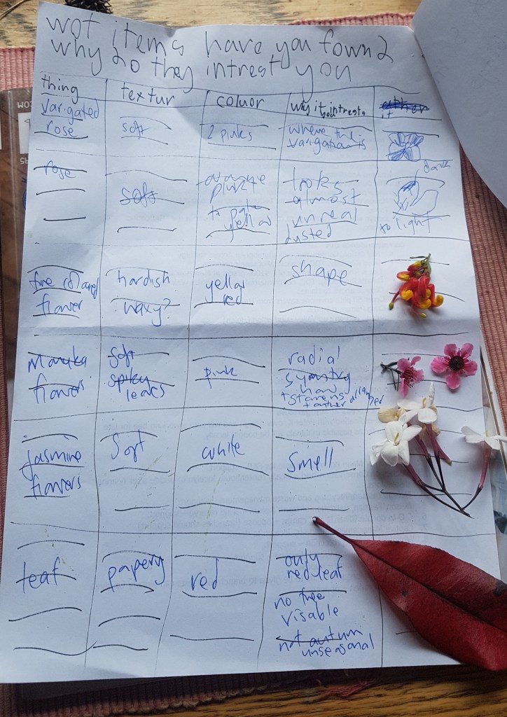 Biology was awesome- it started with us going for a walk so I could fill in the 4 pages of worksheets: a bingo board of things to look for, a page for leaf rubbings (I had to ‘sort’ the leaves into groups and say why they were a group), a table to fill in of things I found interesting, and then an essay about our walk. I even had a deadline of 2pm and the opportunity to win a prize….