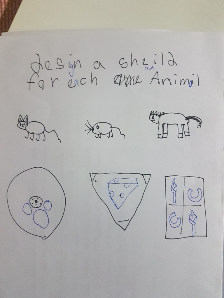My homework started as pages of activity style exercises, matching up, how to draw in steps etc and lots of loving notes. Then I got a whole themed animal activity book. She does these in her bed to the light of a nightlight as she either doesn’t need as much sleep as it says on the tin or has trouble going to sleep- quietning her mind.