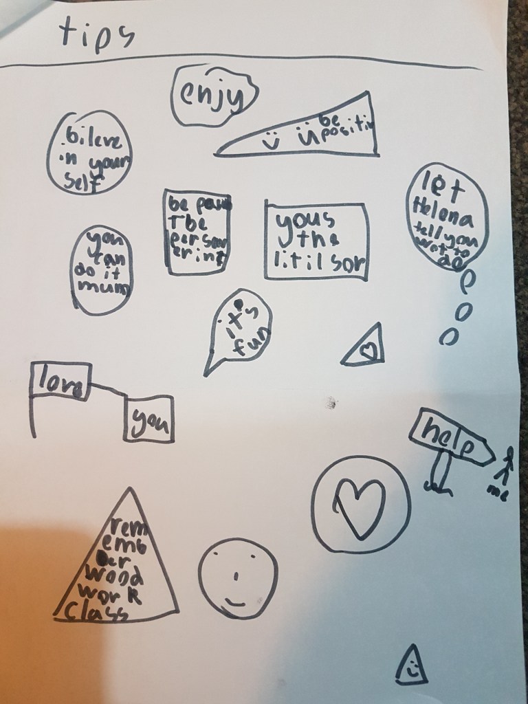 The wodwork homework also had several pages of work but it was so highly prescriptive a task that when I said I didn’t want to make a plane Helena decided to do it, well except she didn’t want to fill in the work sheets so I had to do that part… it was totally like school: draw my plan and label it, draw finished project, draw what I did in steps with instructions… and some tips