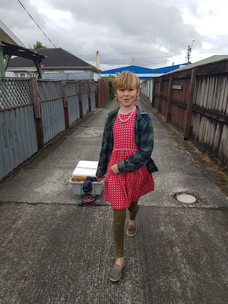It looked like a big box of cherries, impossibly large… all but 9kgs worth. Helena did the calculations. 15$ per kg, 5 for the farmer, 5 for the picker (our cousin) and 5$ for H. She worked out how much she had to spend to buy the cherries then how much she would earn, of course she spent it all in her head before even seeing the cherries. We did some role plays where I was the customer so we worked out how many grams for different prices. There was a bit of “I can’t” at this point.. We wrote it all down. She spent the evening before perfecting her signage, fusing over the stand. She went into the Bakery and asked a very nice stranger if she could have her stand out side their shop – unfortunately they didn’t ring back and were even shut the on the day due to someone being a close contact (Covid is getting closer)… and in the morning it was drizzling so not quite the best start. I printed out Helena’s very own Covid QR tracer code and H dressed in red and green, like a cherry.