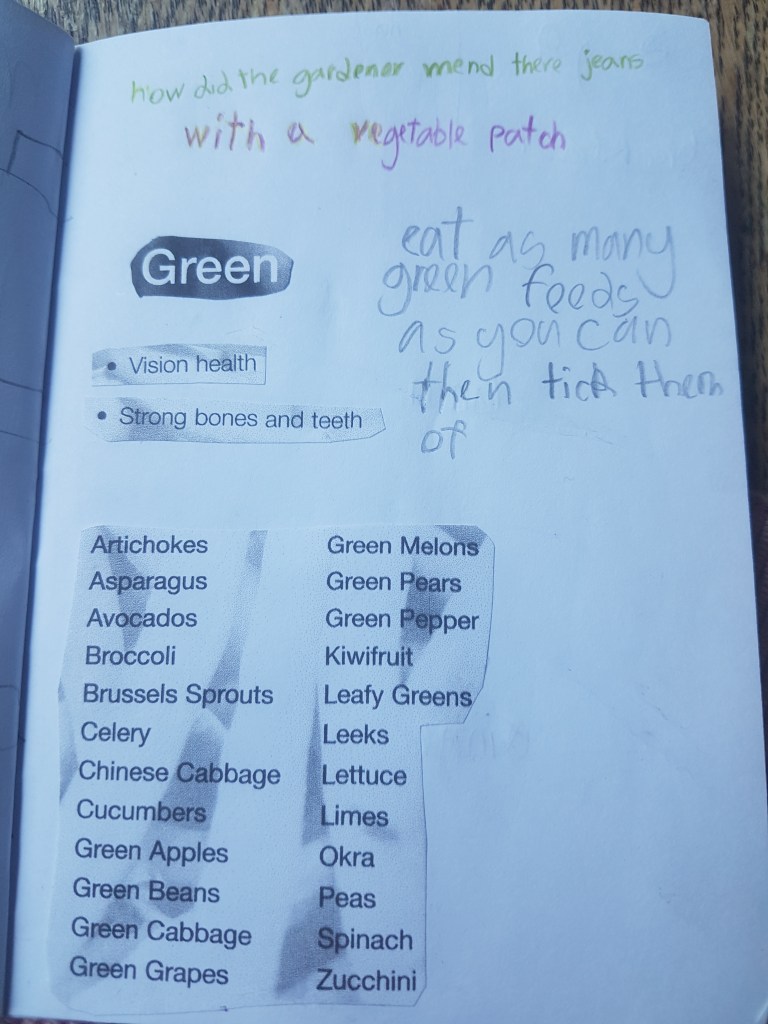 H has made us journals/workbooks to record what we eat to make sure we eat 5+ a day… I haven’t seen them as they are a surprise and they aren’t finished. (A week later and we have started them) Today I had to print out vege jokes and find a website with vege facts.