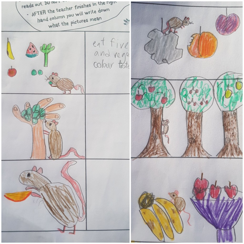I also printed out some lesson plans they had on the 5+ a day site, a Worksheet!! She wanted to do it… she made me read out the statement 3 times because that’s what the lesson plan asked for. Each picture she drew had a rat in it. I don’t know if that would have been acceptable at school. I also waited until she finished before saying the next statement. I also let her use colour and not do all the words.