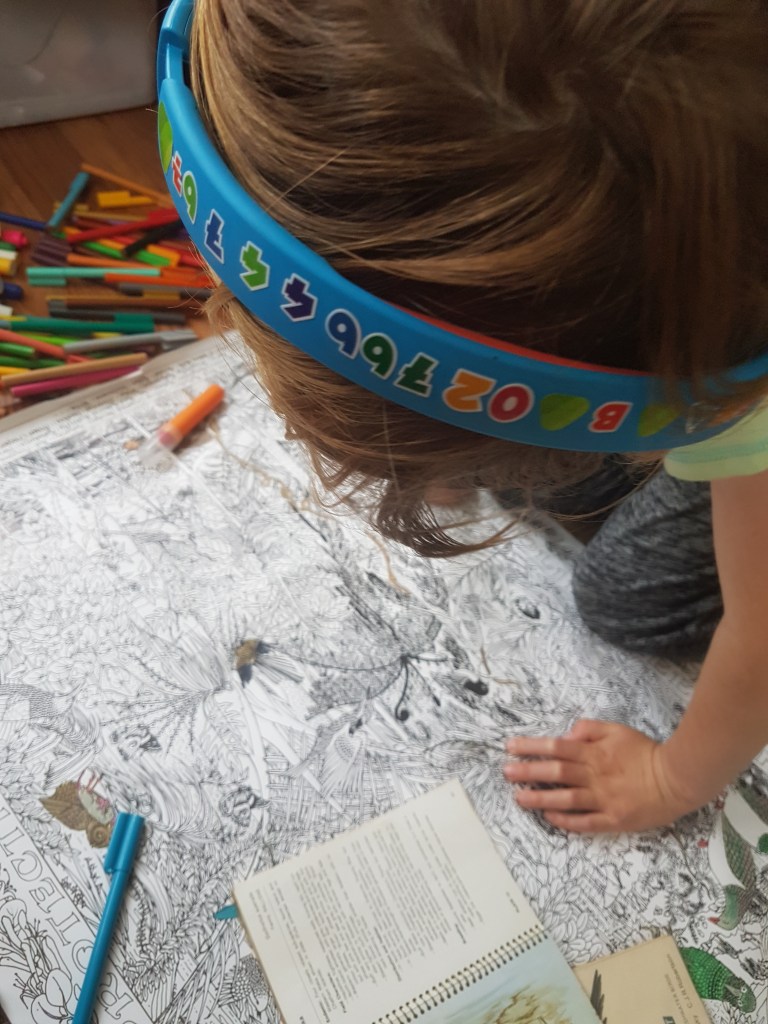 I found some posters that my mother brought way back when and Helena is colouring them in. I kinda thought of this as a filler activity, a little mindless fun. H thought differently…