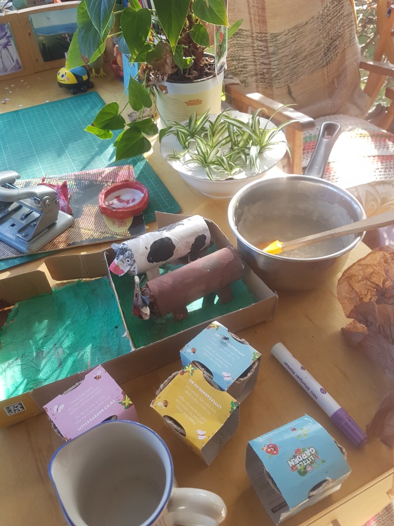 We have been back home from work in Wellington for 2 days. So far every morning Helena bounces out of bed and goes off to do one of her weird and wonderful tasks… In fact the moment we walked in the door off the bus she was making flour and water glue to start doing some more on her paper-machie farm.