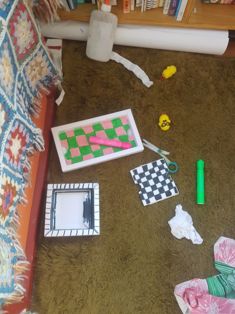 Right now she is making houses for her new plastic Easter tat chickens. Yesterday she was weeding and watering both her gardens and is going to sell some of her excess! What have I done? unpacking and now I am at a loss…. I have jobs to do but a sudden lack of get up and go, an over dose of “what’s the point” and not feeling like it. I feel the lack of structure in our lives. I am putting my hands up in the air and surrendering. I so wish I had her drive, her ideas, her get up and go…. H is so totally able to think of things to do, she fills in time happily, she doesn’t need a push.