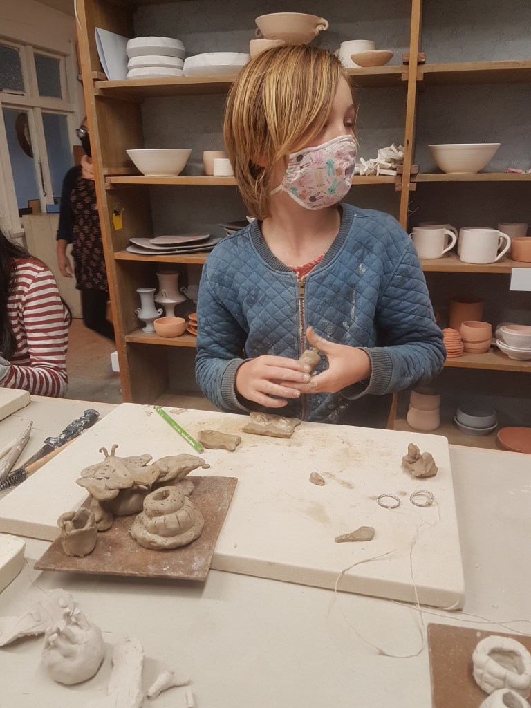 Helena has been doing pottery for a while now. We tend not to do it in the summer terms as I think we will be away more than we are! Helena really likes it on the whole. It is after school social contact with kids who go to schools during the day (not that that is why she goes). It’s a particular kind of contact too – guided by task, she doesn’t have to ‘make friends,’ she doesn’t have to chose who to be friends with, it’s a slow get to know others (collegial). However H stopped wanting to go a few terms back as she found the other children to in her face loud, and distracting, and not as interested in the task as she is. H primarily goes to pottery to make her ideas concrete. She often doesn’t want to make the prescribed idea, mostly this is fine and sometimes she likes their idea -the current idea is so good that she told me that she isn’t allowed to make what she wants (what her mum would like) which has never stopped her before. Helena’s focus is on the clay, chatter is ok as long as she can can get her stuff done.