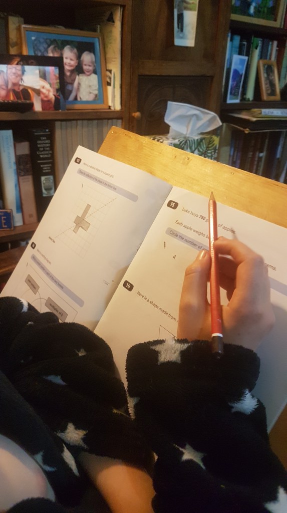 I found some UK kids tests in my teachers college stuff, we must have been given them as a ‘this is kinda like a P.A.T test with out us giving you one’ thing. They are for year 5, level 3-5. I have taught in the UK but couldn’t tell you if that us the same as an NZ year 5, or our maths levels. H would be a year 6 if she was at a school – based on age. I got them out to show Helena what a test was like. She has decided to do them because she wants to! And was aghast that I would let her have as long as she wanted as she had read the instructions which said 45 minutes…