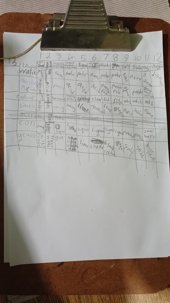 It turned out the science they wanted to do was explosions of the baking powder and vinegar kind. I said I would find them white powders and some liquids… H wanted some red cabbage water. Now, as a small child, it was all throw, it all in at once and make the biggest mess possible. Together, we had done some follow instructions and get some interesting things, but Helena’s interest in the whole process of being systematic and recording the results was zero… She would under some duress or sometimes in play – clipboards are so amazing to get a kid into play adult mode! (Even this morning, she told me she doesn’t like writing). H expressed no interest in the why, possibly because I had told her, and she went into acceptance mode. I say no interest, but of course it turns out there was some listening to me adulting the activity.