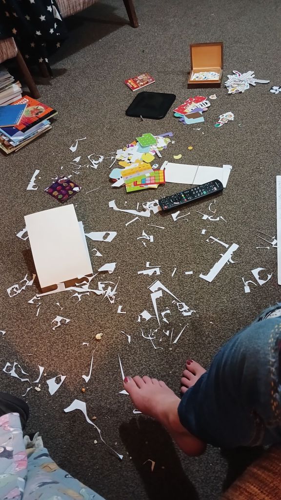 She says, “I like the feel.” There is apparently no word of it. It’s to do with the shapes and colours, cutting patiently around the edges! Making them all flat in the box… This is not a one off, it is a frequent activity.. there are thousands. She is 12. So very weird.