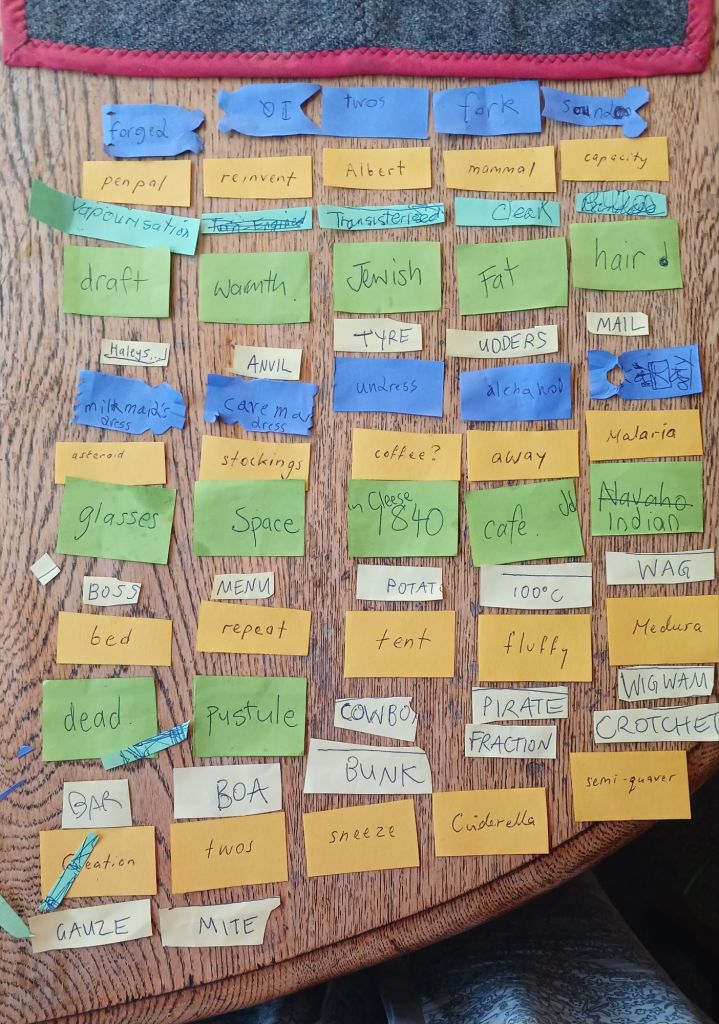 these are some slips from a word game we were playing one evening that she wants to use as story starters – clues, prompts.. then there is also the fortune telling thing she made as another starter idea… and we have been watching the 48-hour movie shorts. Ideas abound.