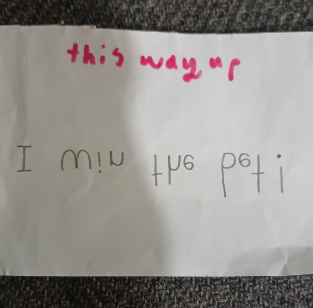 I bet her she couldn’t write mirror writing upside down. It says I win the bet…..